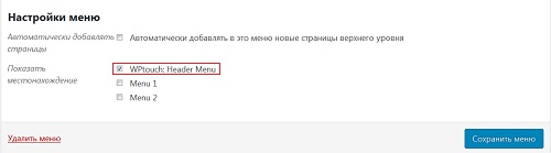 7) И самый важный момент, который многие упускают: перед тем как сохранить меню, надо там, где «Показать местонахождение», выбрать: WPtouch: Header Menu. По крайней мере, в моей теме wordpress это оптимальное решение.