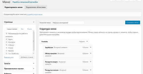 6) Все блоки готового меню, в роли которых выступают: страницы, записи, рубрики и произвольные ссылки можно упорядочить под себя: поменять местами, сделать дочерними.